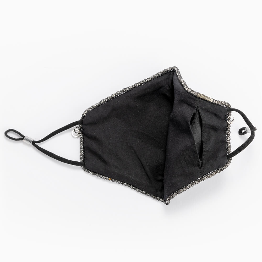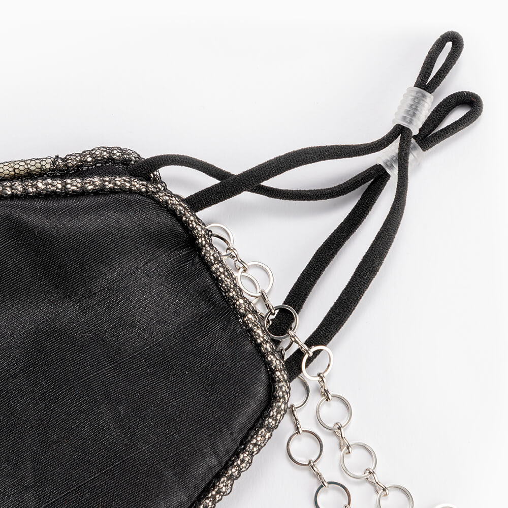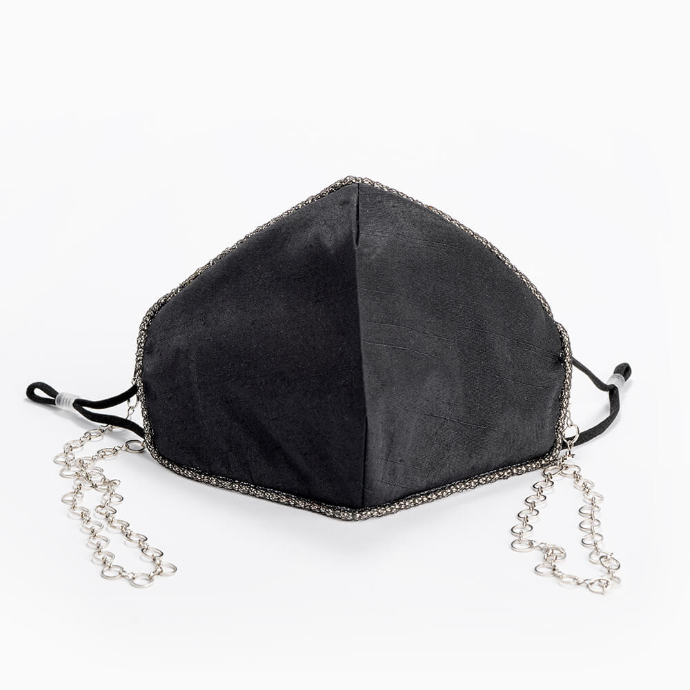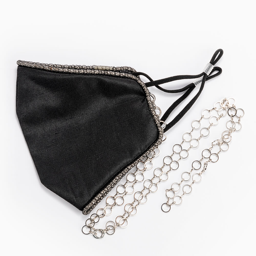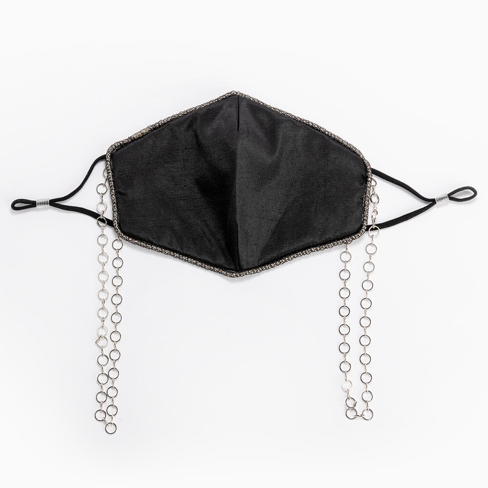 Add a contemporary edge to your looks in our sleek party-wear rendition of face mask that boasts of in vogue charisma. Hand-made to sartorial perfection from premium quality Shantung silk fabric, it assures a soft and soothing touch against the skin while it subtly exudes luxury. The exquisite silver trim embellishment makes it an irresistible choice. The accessorized chain adds to its luxury appeal and it is sure to fetch you compliments from all.